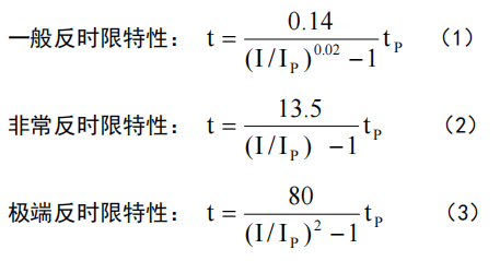 可选择使用下面三个标准的反时限特性之一。反时限特性电流基准值 IP 为相间反时限保护电流基准定值,反时限特性时间常数 tP 为相间反时限保护时间常数。