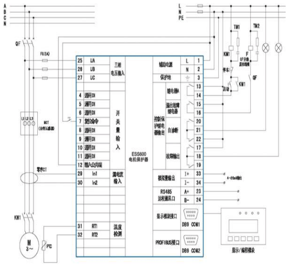 通过监测电动机三相回路的电流、电压等参数对电动机进行全面保护(具有启动时超时、过载、堵转、断相、不平衡、接地故障、漏电、短路、欠载、超温、过压、欠压、频率、欠功率因数、相序错乱等多种保护功能,可对电动机进行全面的保护并可选“抗晃电” 功能和欠、失压重启功能)