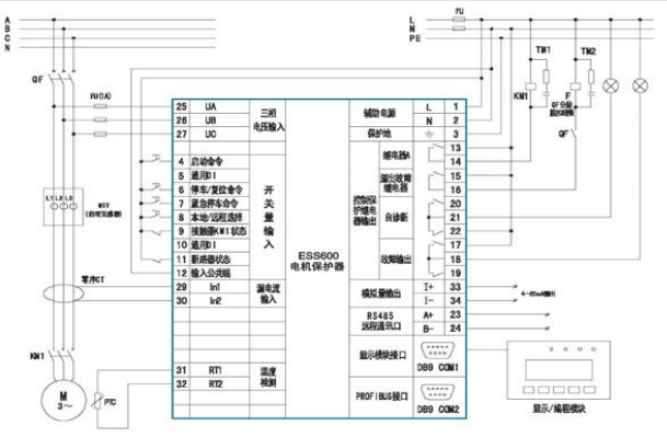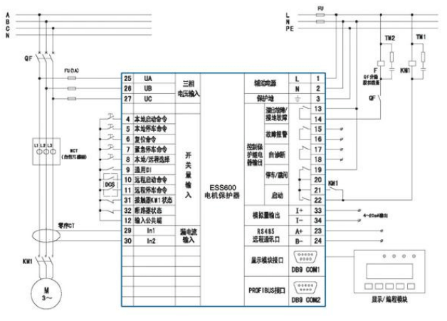 注 1:远程启动、停车、复位控制只有在 DI5(本地/远程选择)接通为远程控制的时候才有效,此时本地显示模块无法进行启动、停车、复位控制。“紧急停车”按钮与保护器本体上的红色复位按钮一样,不受远方/就地状态限制。上图中的远程启动按钮、停车/复位按钮、 紧急停车按钮都采用点动式,停车/复位按钮短按为停车,长按>3 秒停车并复位
