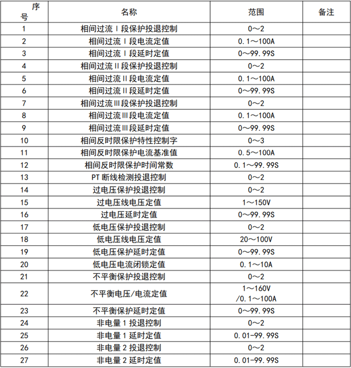 本装置设置三段相间过流保护, Ⅰ、Ⅱ、Ⅲ固定为定时限,相间过流保护还可以投入反时限。无论定时限或反时限,各段的投退控制定值可独立控制各段的使用情况。投退控制 定值取值含义为: